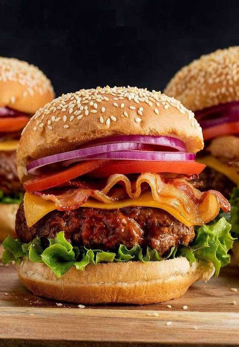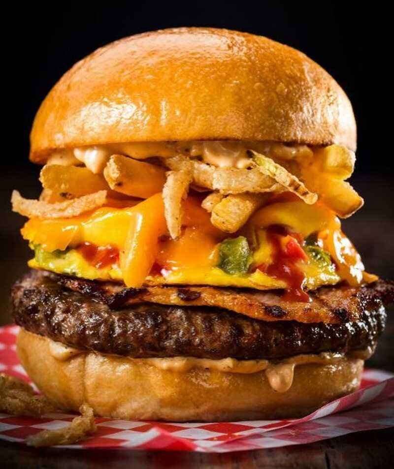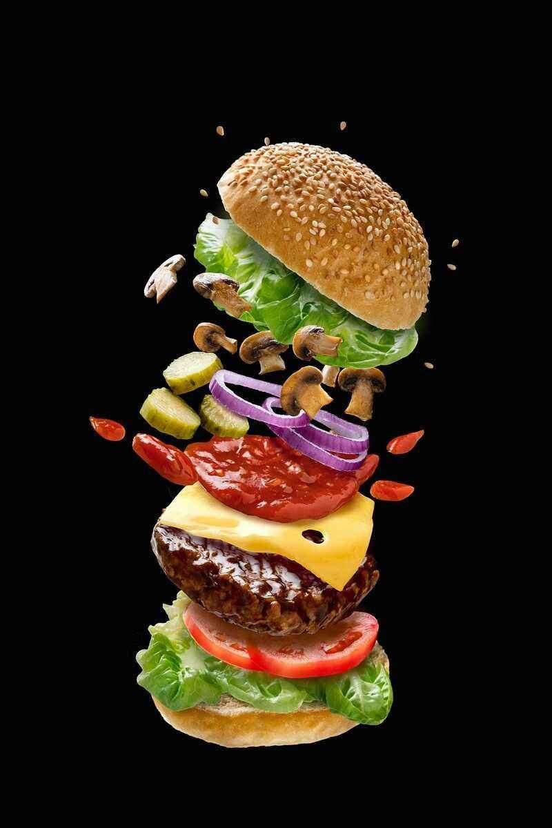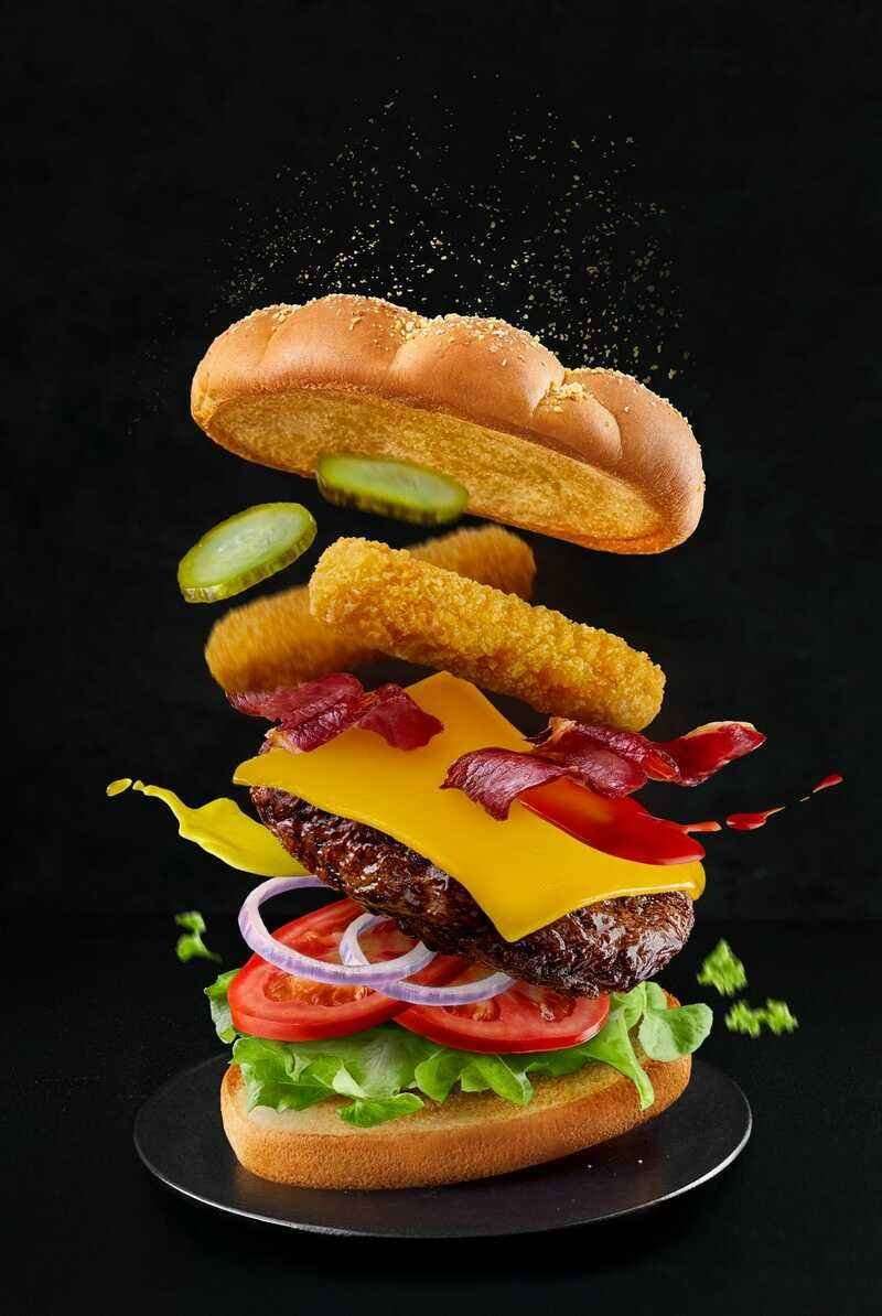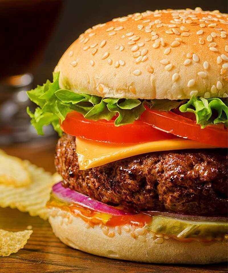 Hamburger eti, küçük boy susamlı sandviç ekmeği, salatalık turşusu, hardal ve ketçaptan oluşan lezzet. Enfes patates kızartması ve içeceğiyle birlikte Hamburger